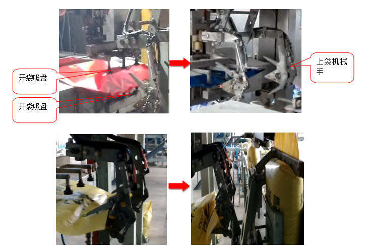 上袋裝置中開袋吸盤從包裝袋口上下兩個方向同時將包裝袋口吸開,上袋機(jī)械手伸入袋口內(nèi),將袋的上下兩面同時夾住,彎曲機(jī)械臂將包裝袋套到定量包裝秤下料口,過程結(jié)束。