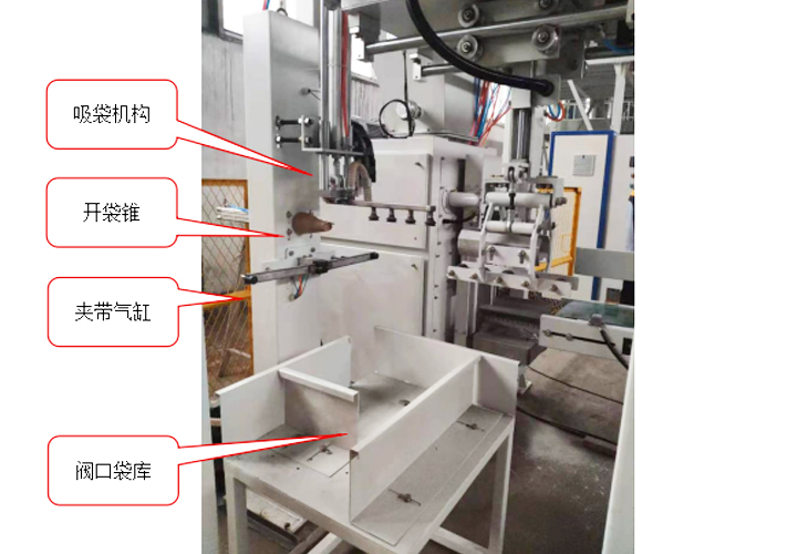 其工作流程:將袋子放在袋庫中,由系統(tǒng)控制吸袋氣缸將袋子吸起,在上升的過程中由夾帶機(jī)構(gòu)將袋子夾住,再由開袋機(jī)構(gòu)將袋口打開,最后由氣缸拖動(dòng)套袋機(jī)構(gòu)將袋子套在出料口上,至此完成一套上袋動(dòng)作。