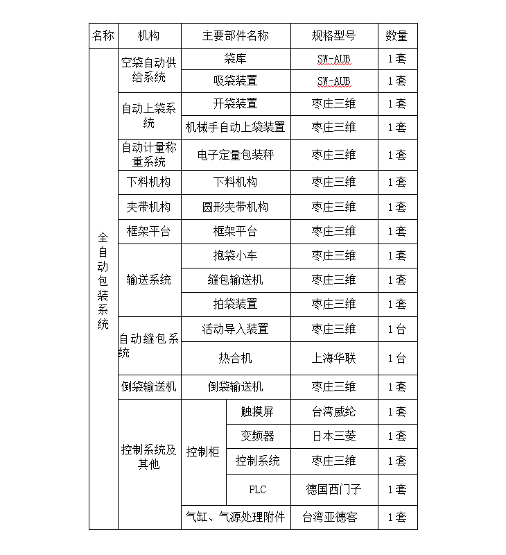 PTA全自動包裝機主要有以下機構(gòu)構(gòu)成:定量電子秤、供袋機構(gòu)、上袋機構(gòu)、裝袋機構(gòu)、夾口整形機、收塵機構(gòu)、折邊縫包系統(tǒng)、倒袋機構(gòu)組成。詳細(xì)配置如下: