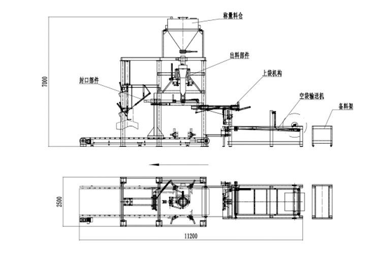 全自動機(jī)器上袋氧化鋁噸袋包裝機(jī)主要機(jī)構(gòu):氧化鋁空袋輸送機(jī)構(gòu)、自動上袋機(jī)構(gòu)、氧化鋁自動稱量機(jī)構(gòu)、氧化鋁自動灌裝機(jī)構(gòu)、自動熱合封口、自動噴碼打印、氧化鋁自動輸送機(jī)構(gòu)。簡略圖紙如下: