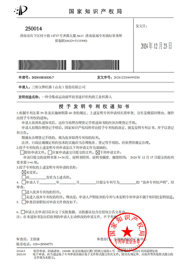 熱烈祝賀三維漢界機(jī)器(山東)股份有限公司首席科學(xué)家山顯雷教授親自主導(dǎo)研發(fā)的 “一種含集成運(yùn)動(dòng)副平面多連桿機(jī)構(gòu)的工業(yè)機(jī)器人” 成功獲得中國發(fā)明專利授權(quán)!
